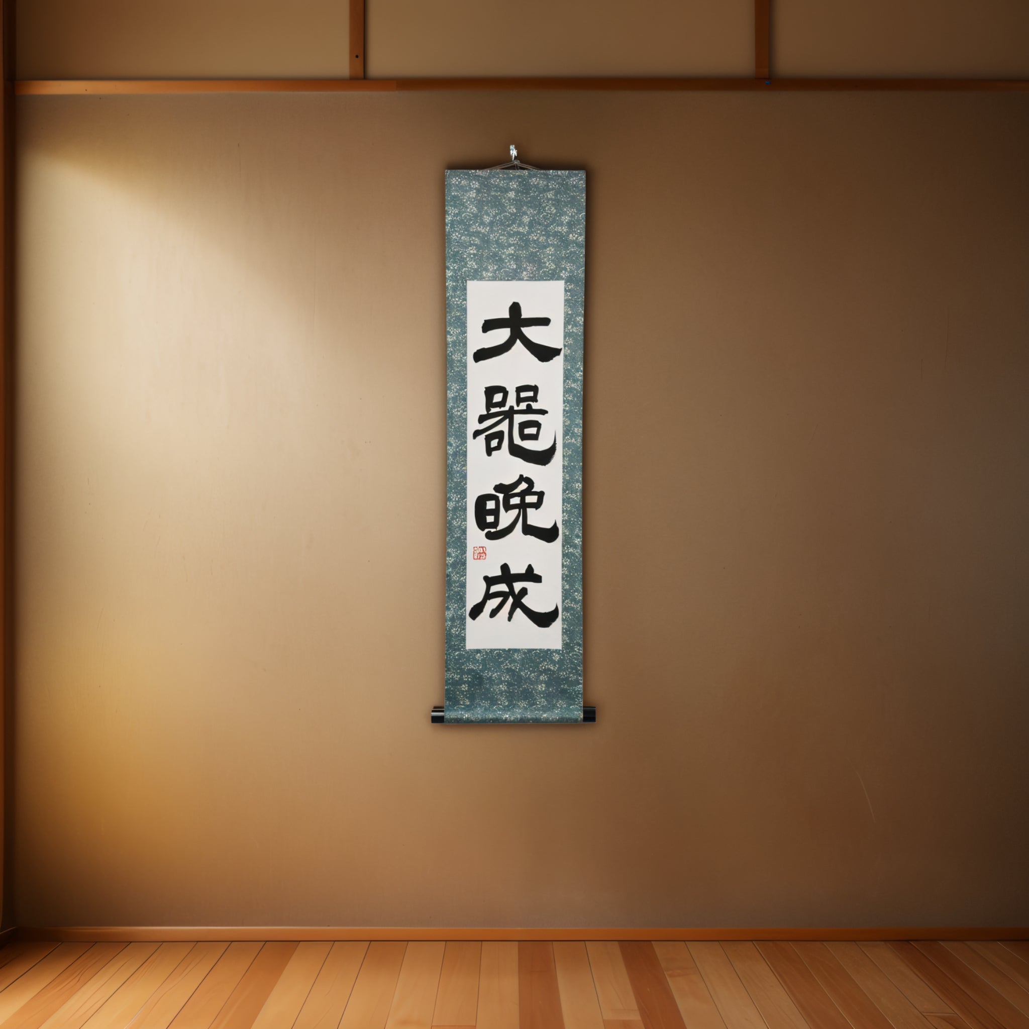 This Japanese calligraphy scroll features the timeless phrase 大器晩成 (Taiki Bansei) — a classical expression rooted in ancient Asian philosophy. Literally meaning “a great vessel is slow to form”, it teaches that true greatness does not appear quickly. The most profound talent, strength, and character are shaped slowly, through years of experience, discipline, and inner growth.