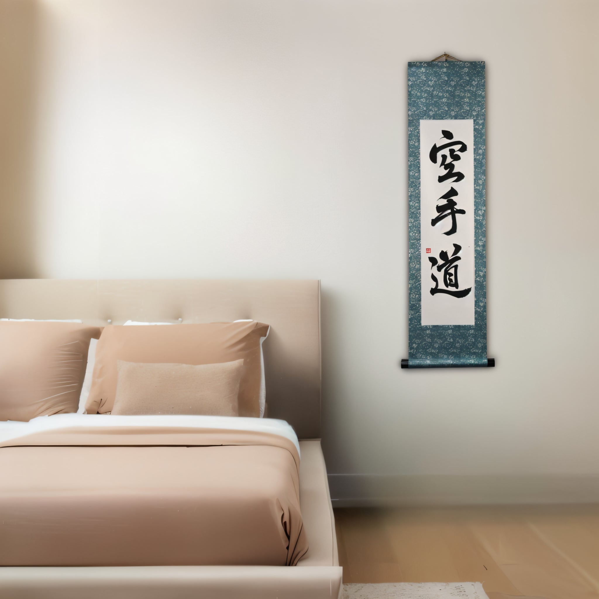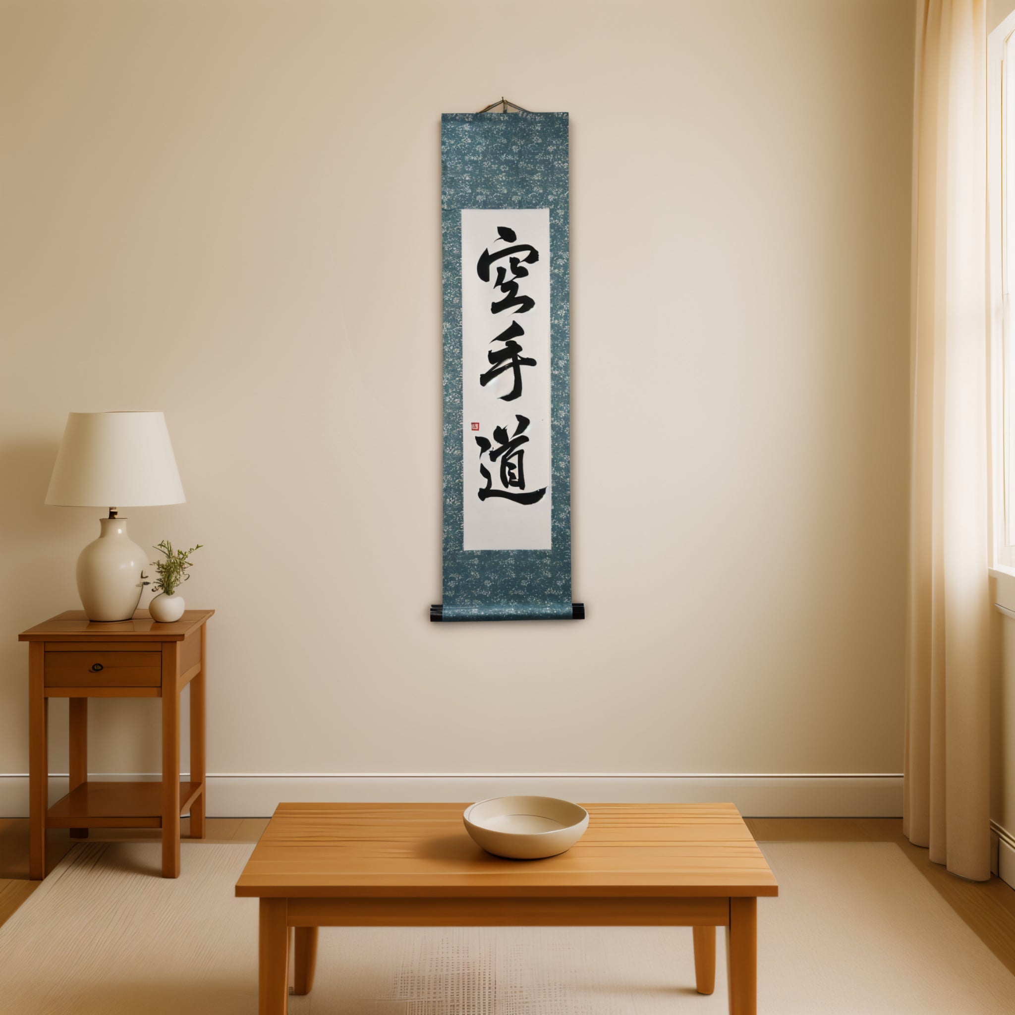 Ce rouleau de calligraphie présente la puissante phrase 空手道 (Karate-do) — non seulement un art martial, mais un voyage de toute une vie fait de discipline, de respect et de force intérieure.