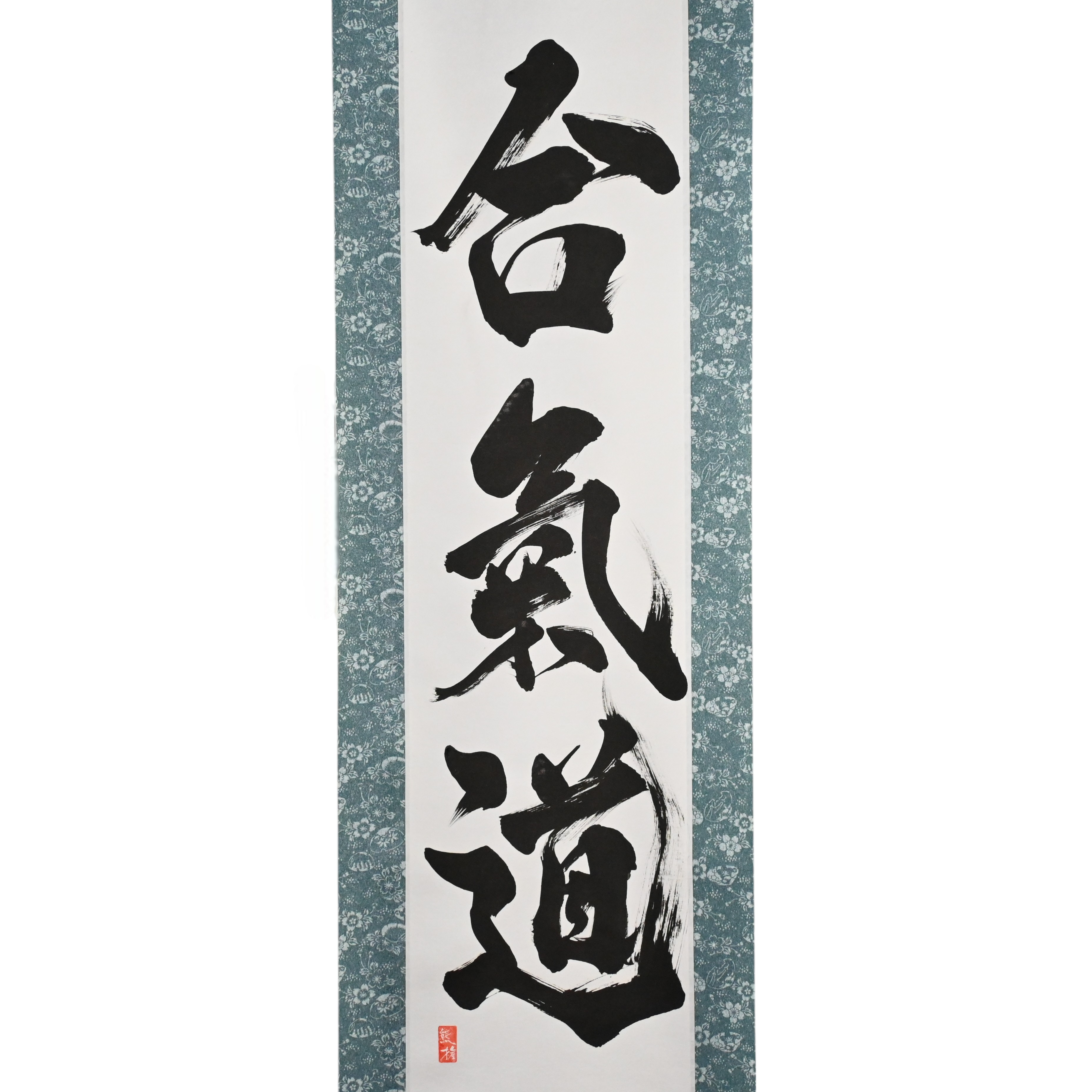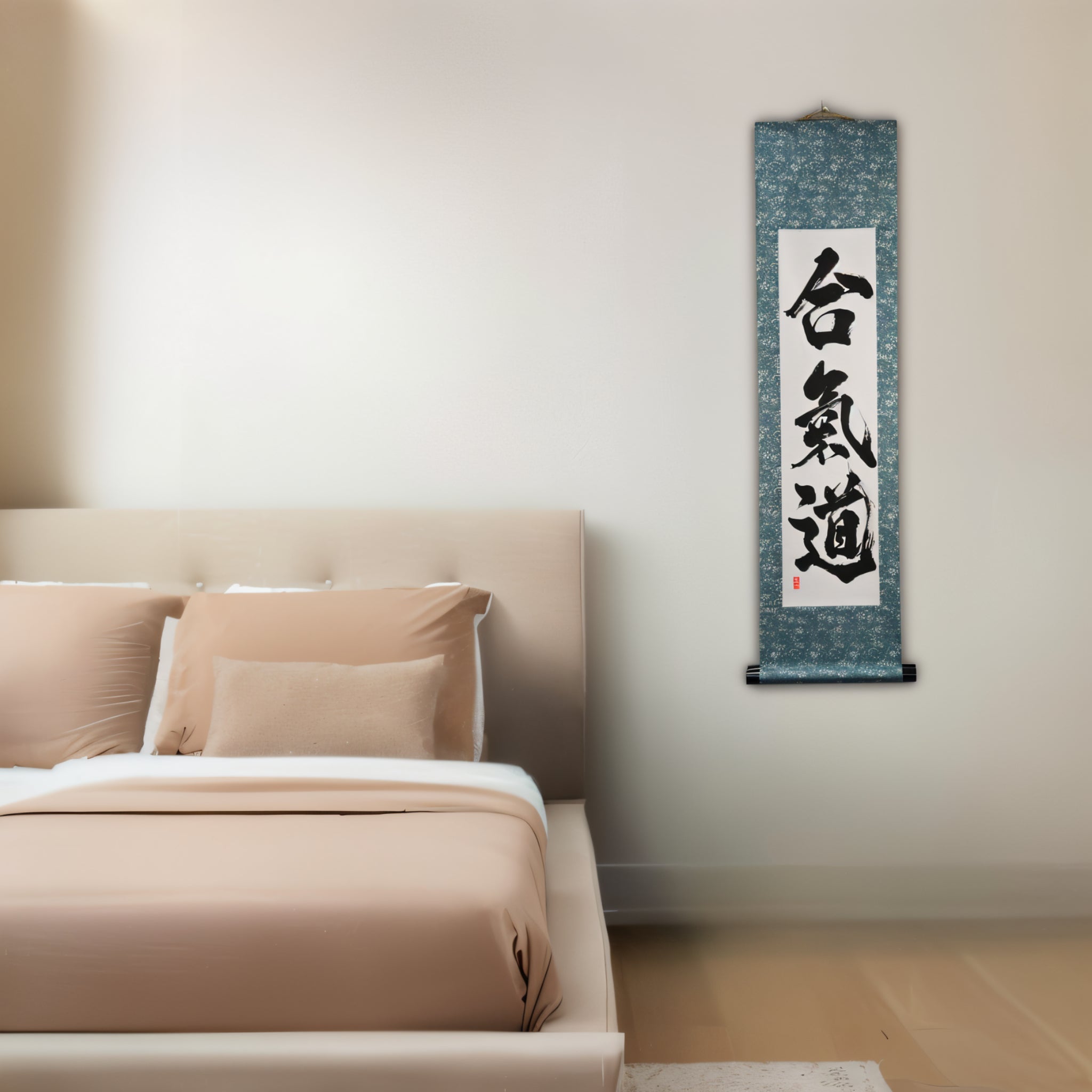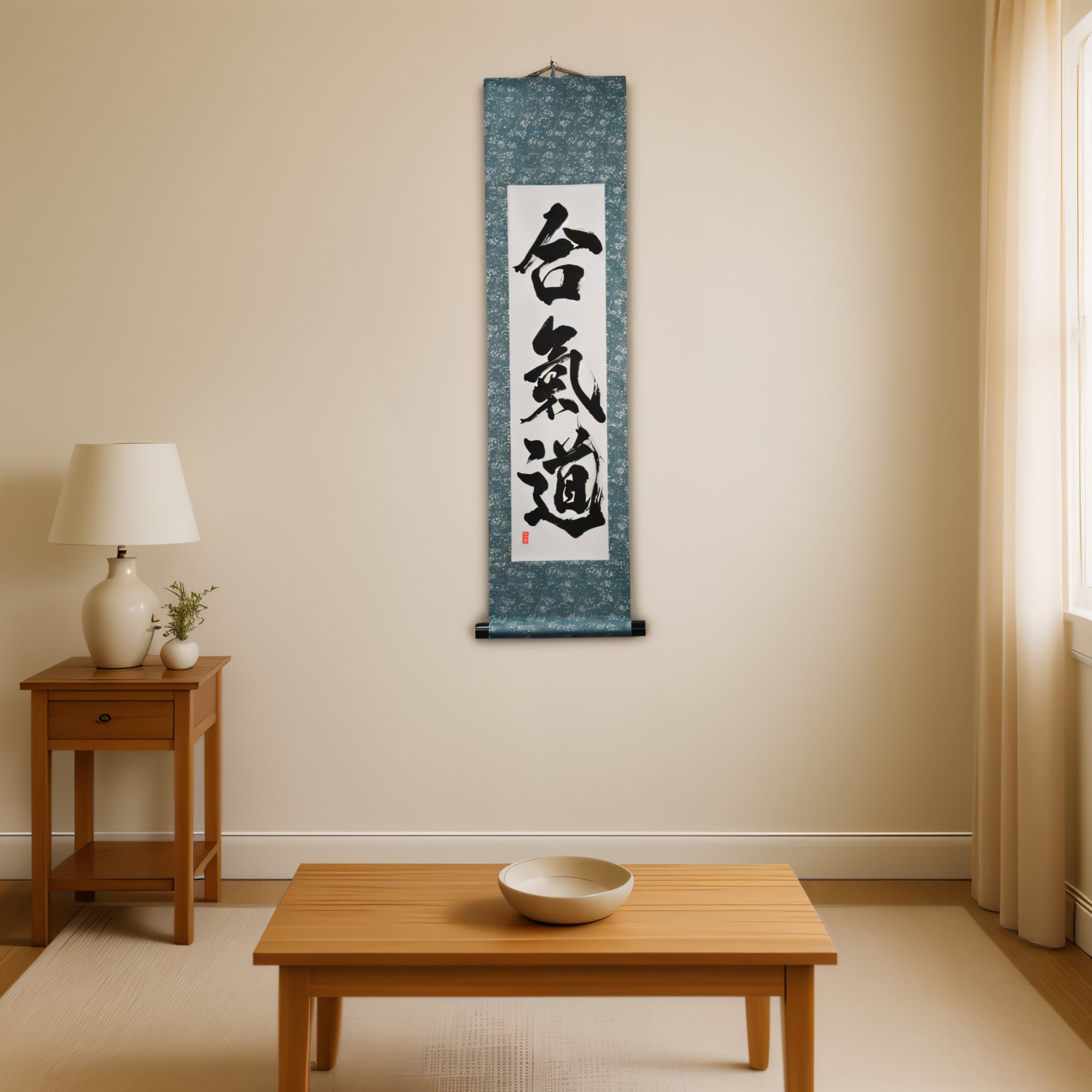 Questo rotolo calligrafico mostra con orgoglio i tre caratteri di 合気道 (Aikido), rappresentando non solo l'arte marziale, ma anche l'impegno e il cammino che percorri nel tuo allenamento. Non è solo una decorazione, ma un simbolo del tuo viaggio, della disciplina e dello spirito dell'Aikido.