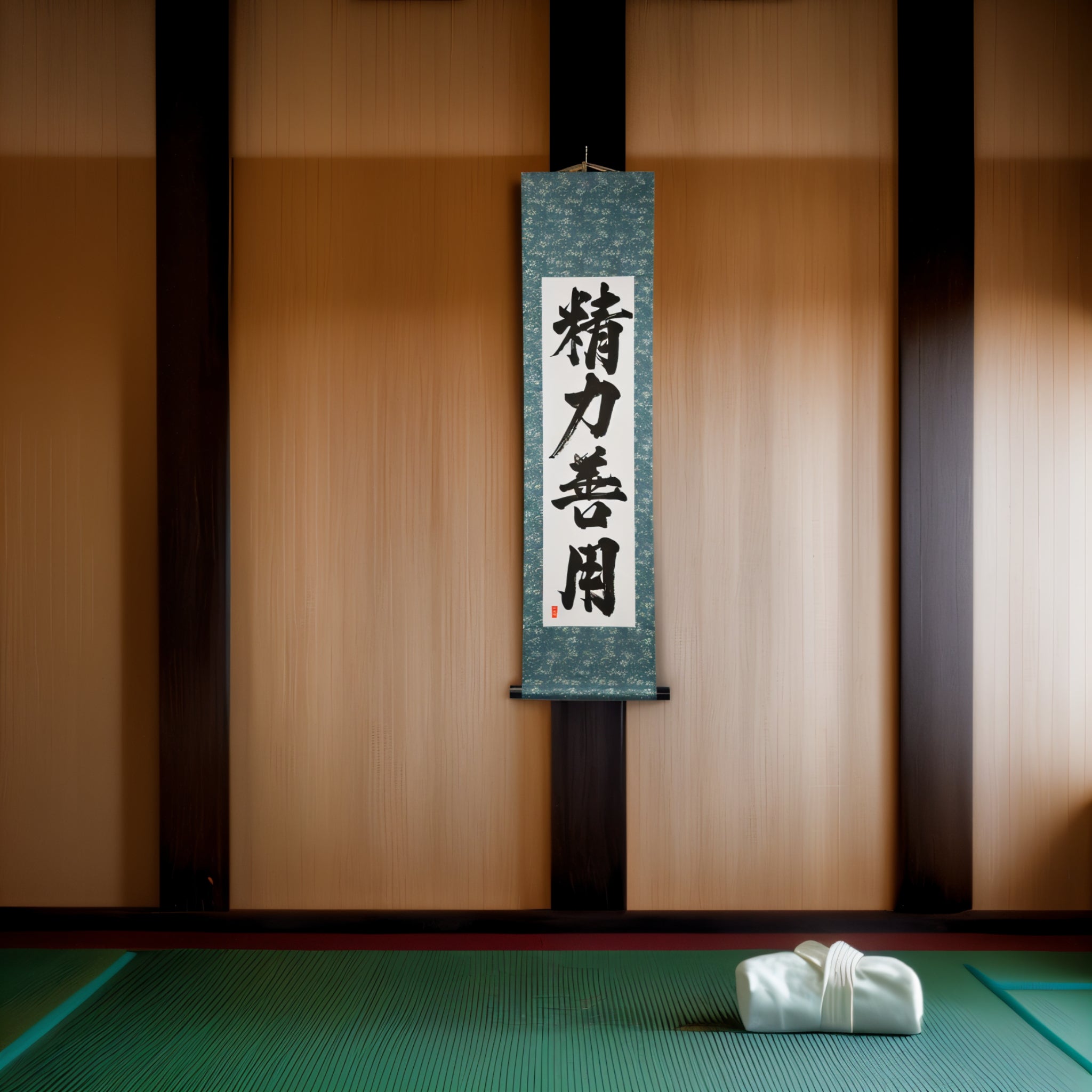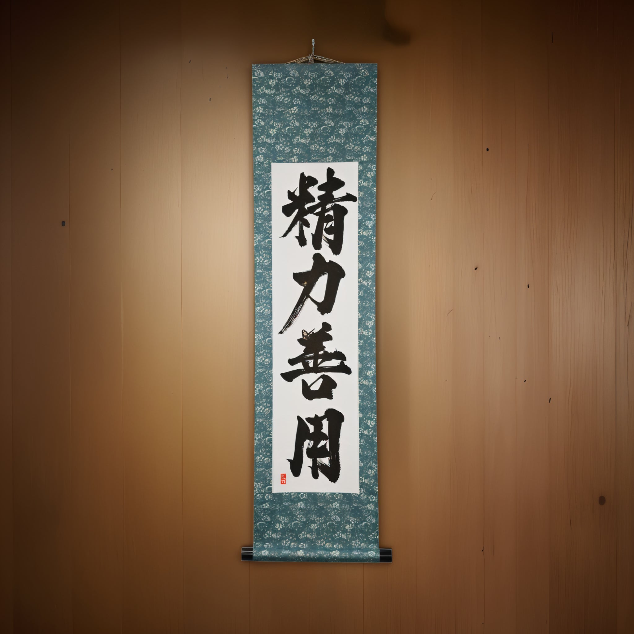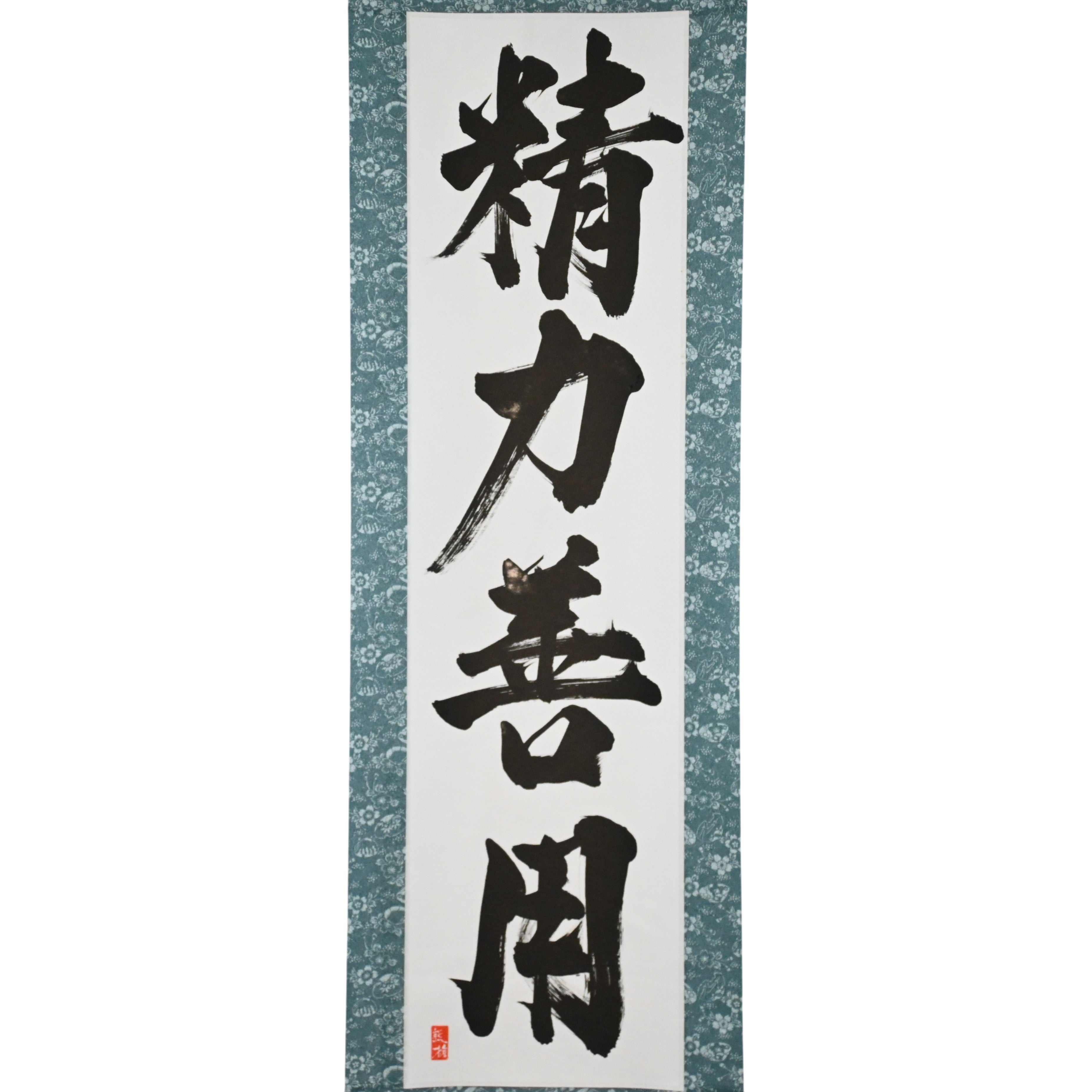 Questo rotolo di calligrafia giapponese presenta la frase senza tempo 精力善用 (Seiryoku-Zenyō) — tradotta come "Massimo Uso Efficiente dell'Energia". È uno dei due principi fondamentali del Judo, insieme a 自他共栄 (Jita-Kyōei, "Benessere e Beneficio Reciproco"), entrambi stabiliti dal fondatore del Judo, Jigoro Kano (嘉納治五郎).