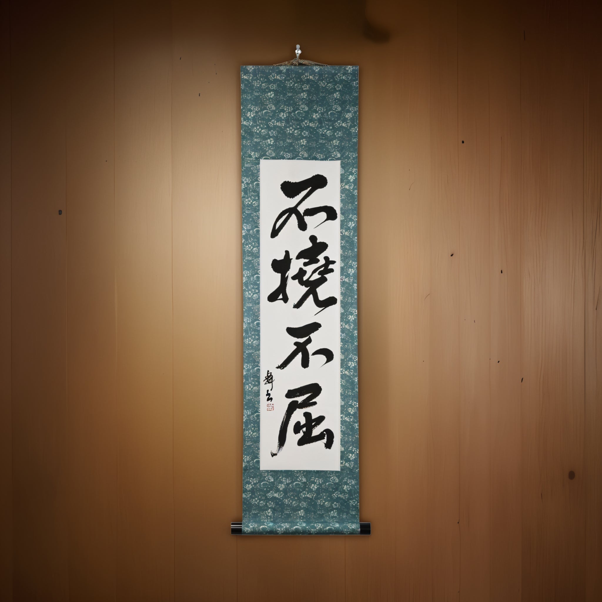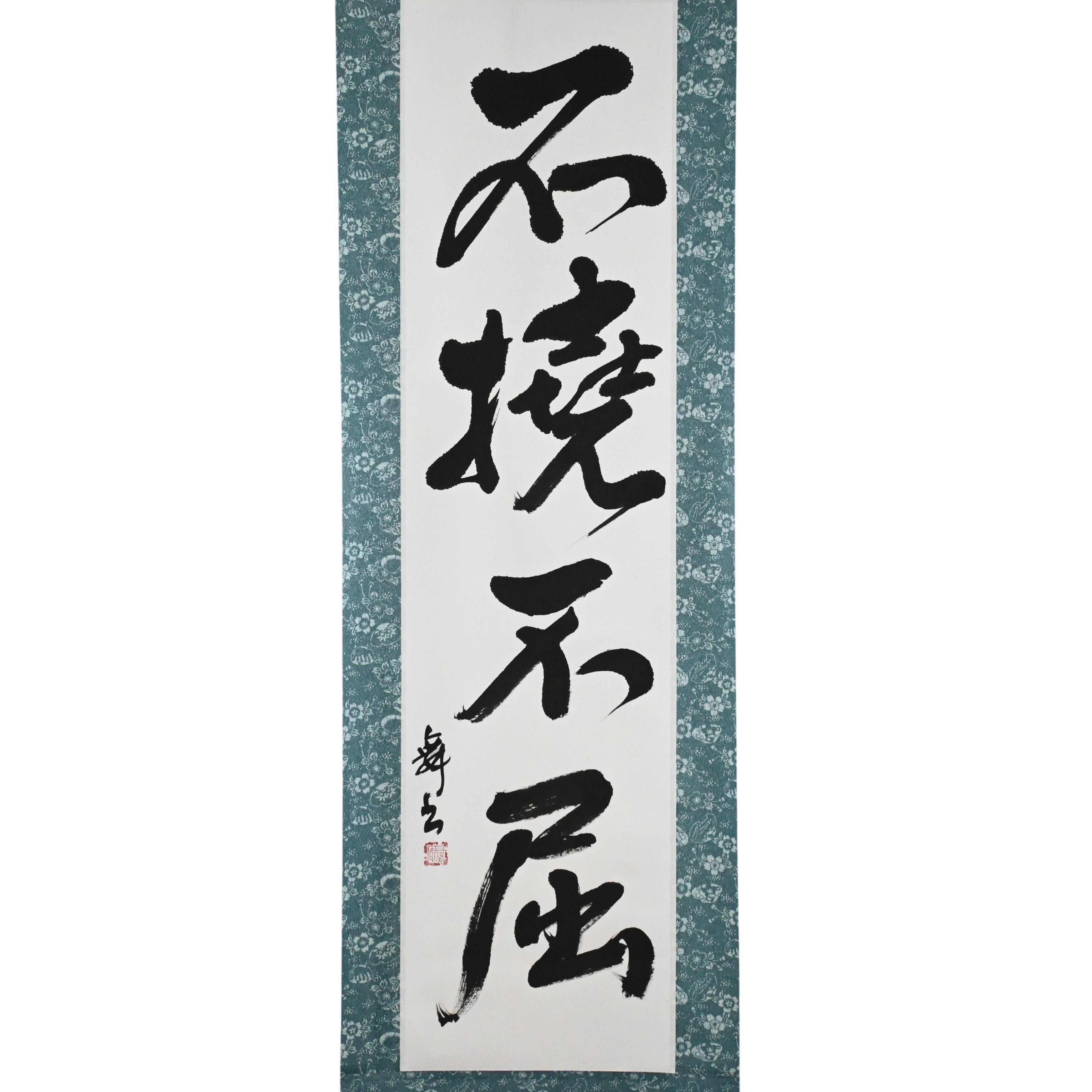Questo rotolo di calligrafia giapponese presenta la frase audace 不撓不屈 (Futō Fukutsu) — un'espressione potente dello spirito indomabile che è al cuore delle arti marziali giapponesi e del codice dei Samurai.