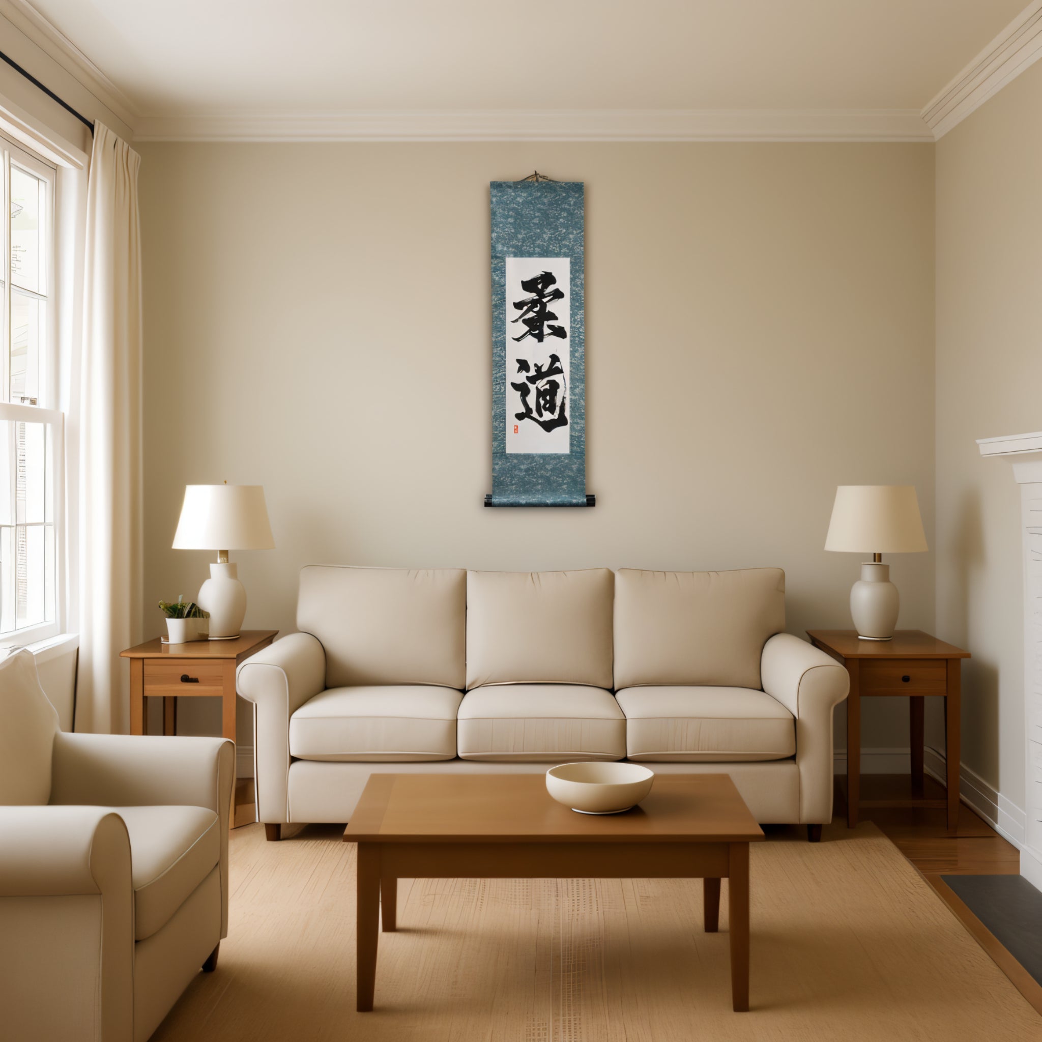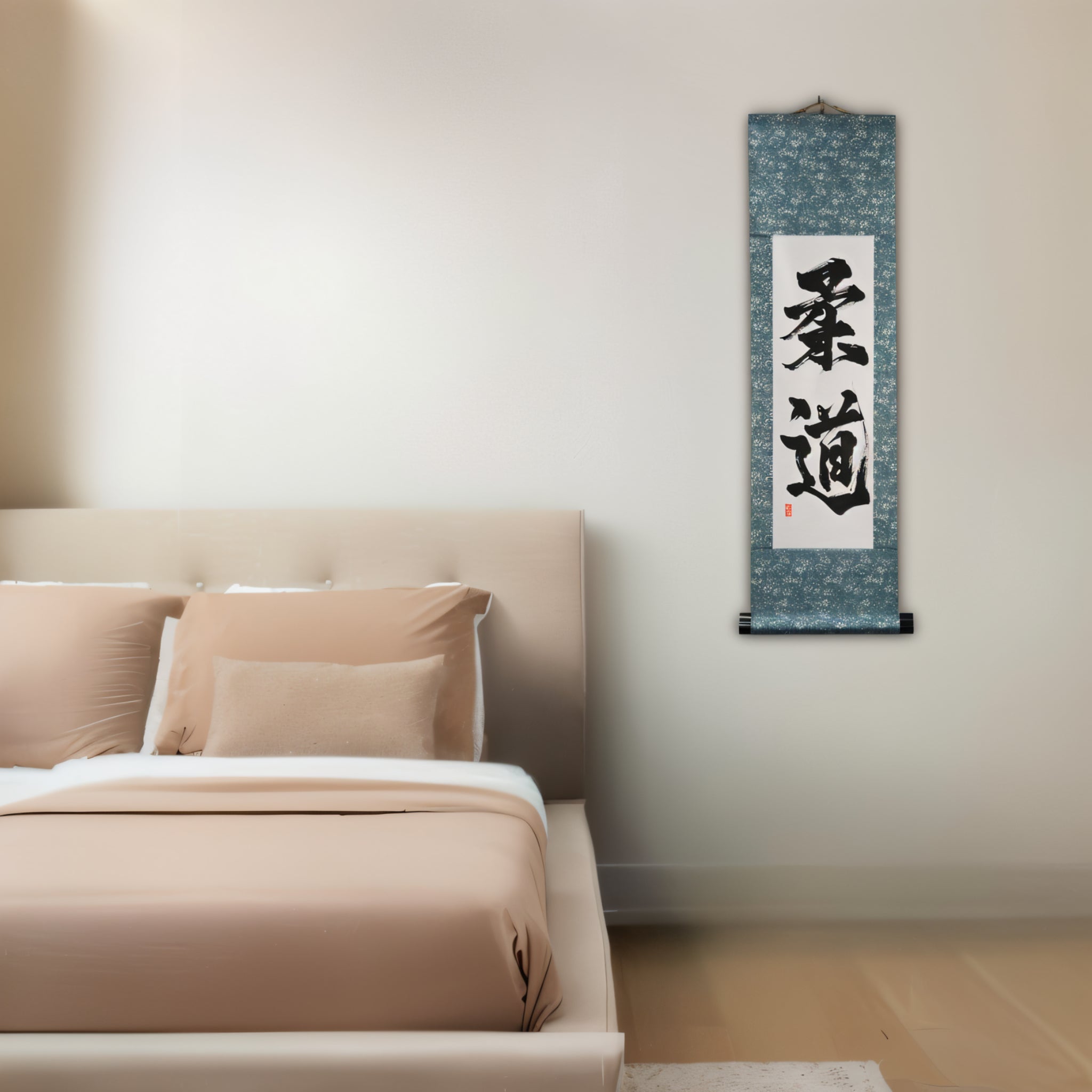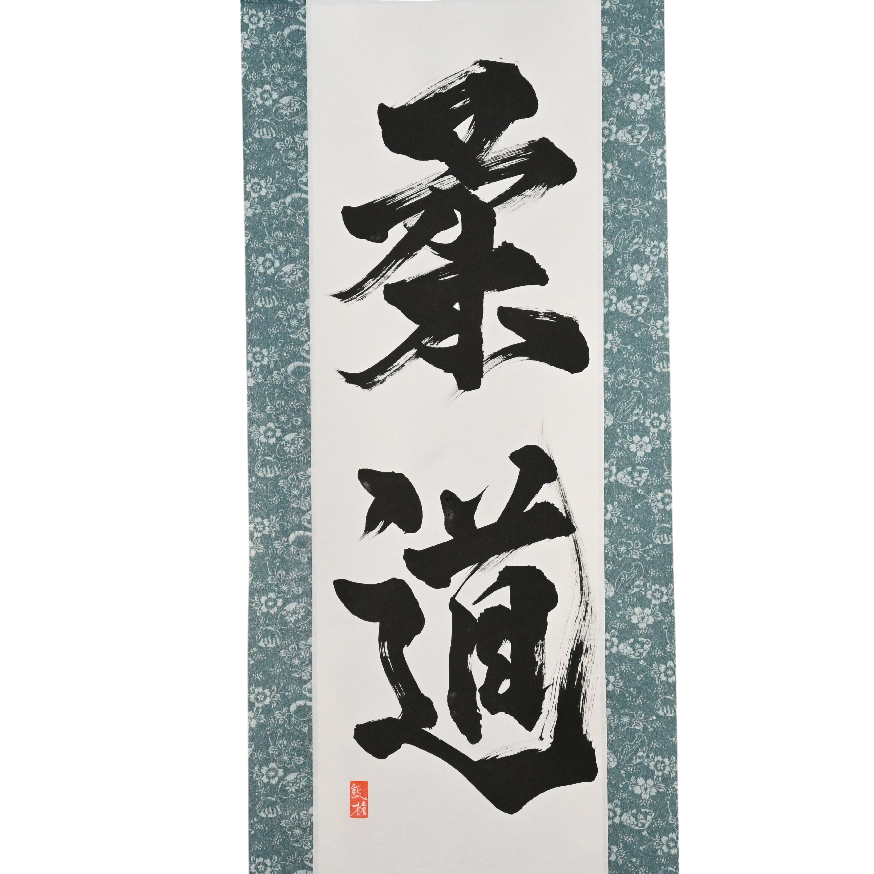 Diese Kalligraphie-Rolle zeigt die kühnen Schriftzeichen 柔道 (Judo), ein Wort, das weit mehr bedeutet als nur eine Kampfsportart. Judo ist sowohl eine Disziplin als auch eine Philosophie — ein Weg, den Körper zu stärken, den Geist zu beruhigen und den Charakter durch Übung zu entwickeln.